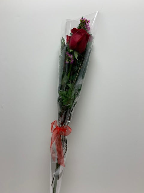 Beautiful Premium Long Stem Red Rose is wrapped in plastic and tied with a sheer red bow. It has a water vile to keep it hydrated.